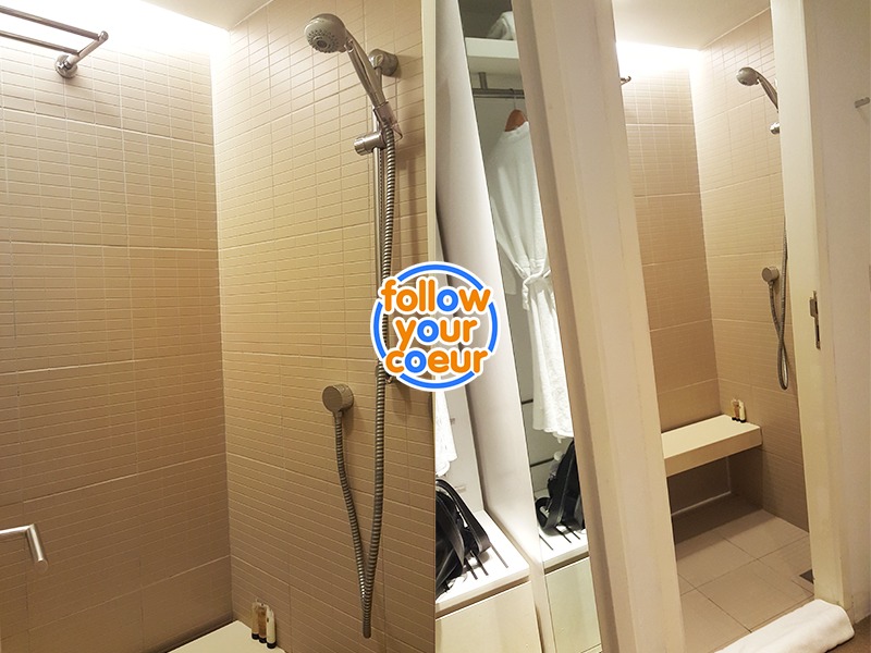 進門的右手邊就是洗澡的空間,一樣都很窄小,但比洗手間好~ 放置毛巾衣物的位置不多,所以洗澡時很容易弄濕衣物。水溫和水壓是正常的~