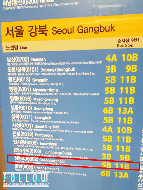 沒有記錯第一班巴士是韓國時間凌晨6時。所以我們在機場內休息了2個多小時,大約5時50分就走去出巴士站了。乘坐的人不多,畢竟是第一班車。司機叔叔一見到你就會用普通話問你去哪裡,簡單回答了之後,他就會很熱心地幫你拿行李,然後會給你一張貼紙,方便你下車的時候找回你的對應行李。然後你上車將錢幣投入錢箱就可以啦。記住是不設找續的。