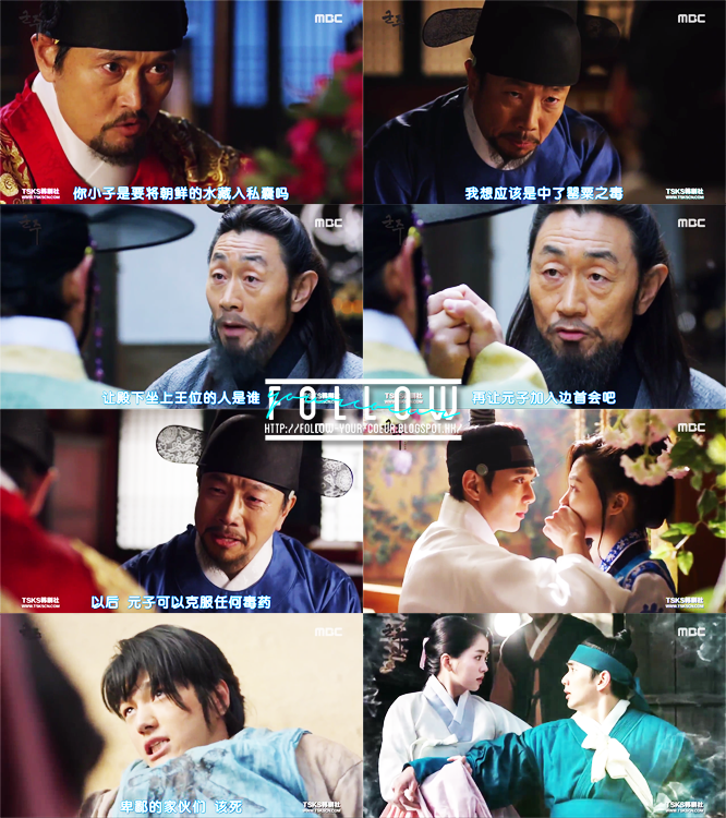 人老了真的淚點會比較低,這集被承豪的演技感染了幾次。尤其是聽到父親叫他親手將佳恩爸爸斬首的那幕和抱著千秀哭的那幕真的演得很好。王其實也演得好好,前輩(哈哈!前輩也叫金明秀)的抑揚頓挫掌握得很好,語氣當然沒有挑剔,教訓世子的場面和看到兒子很痛苦這兩幕都很有感染力。雖然所炫這集出場很少,但是最後看著父親被斬首的大特寫真的很有感情!!