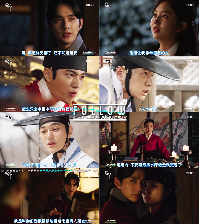 得知佳恩跟母親和妹妹要離開的消息,異線忍不住去了看她們。可是被大木發現了…更甚的是他看到世子在遠處,為了要保住世子,他轉移了大木的視線…世子看到異線一直替他受苦也感到很抱歉和心痛…所以決定稍後要進宮跟他見面。(金明洙你好棒喔!演技真的進步了很多!抱著妹妹哭的時候+發現大木的時候真的演得很好!)