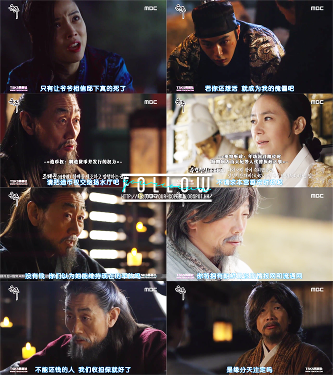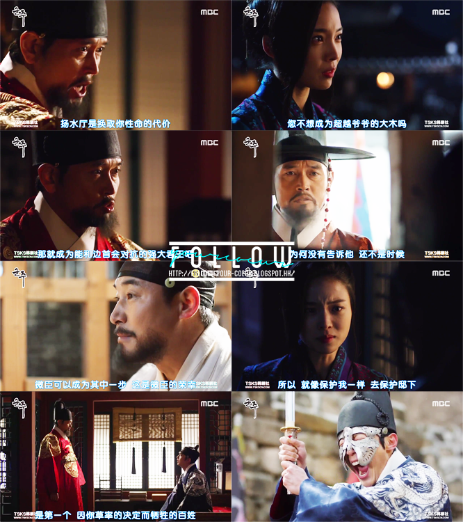 我看這集真的很不集中。唯一想稱讚的是金明洙演技這集有比較好。王跟他練習審問的時候那個突變的聲線處理挺好的,眼神也很有戲!被王審問身世那部份都做得很好啊,不過還是那個問題,聲調這個真的無法改變哈哈。