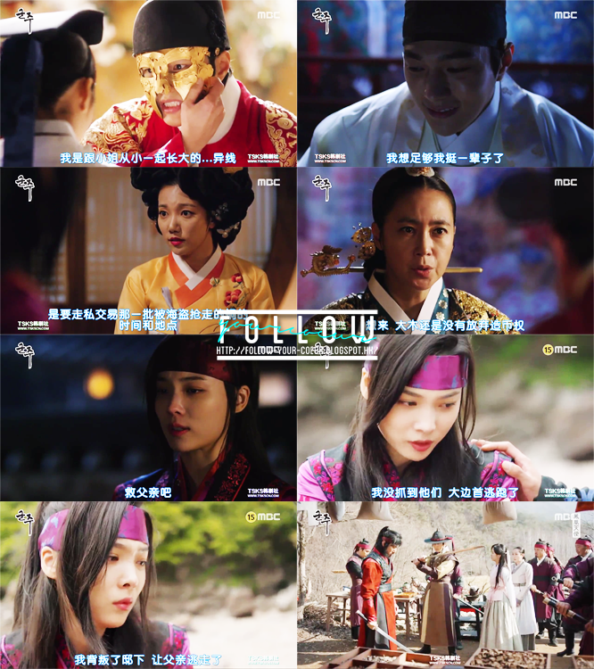 這集我覺得真的寫得很亂,而且有些情節真的很牽強。舖排得不好而且有很多漏洞。大木辦完入團式之後帶異線回去那部份理解不能…不知道是翻譯的問題還是原本真的是字面的意思…看得我一頭霧水…他生氣因為王設局想剷除他我明白,但是帶了「世子」回去然後又想去殺掉王,那麼你為什麼不一早就殺掉他們呢?還要搞這麼多事帶世子去入團…什麼鬼?世子跟佳恩的感情戲又很硬加,完全不合氣氛…