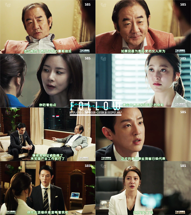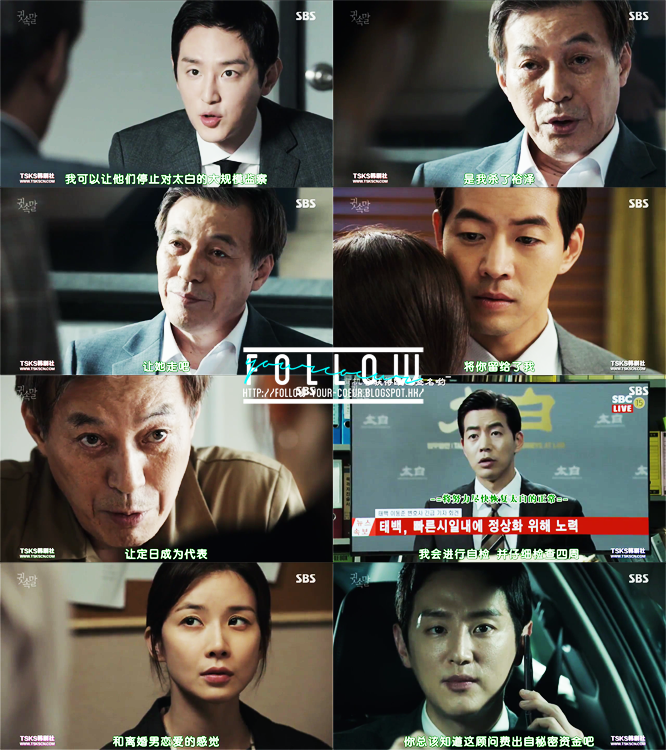 那邊廂英珠也追查到那些黑金的下落跟秀妍媽媽有關,所以捉了她回去查問,但是她有幽閉恐懼症,所以秀妍不忍心看媽媽坐牢,主動去找爸爸商量,但是爸爸竟然說媽媽撐得過的,叫她保住太白為先,甚至叫她跟正日結婚。(欣賞朴世榮這裡的失望和傷心演技!看到爸爸為了榮譽而連媽媽都願意放棄,秀妍終於意識到爸爸是個不顧親情的人,一直被他擺佈也只是為了守住太白,他這輩子最大的榮譽。)