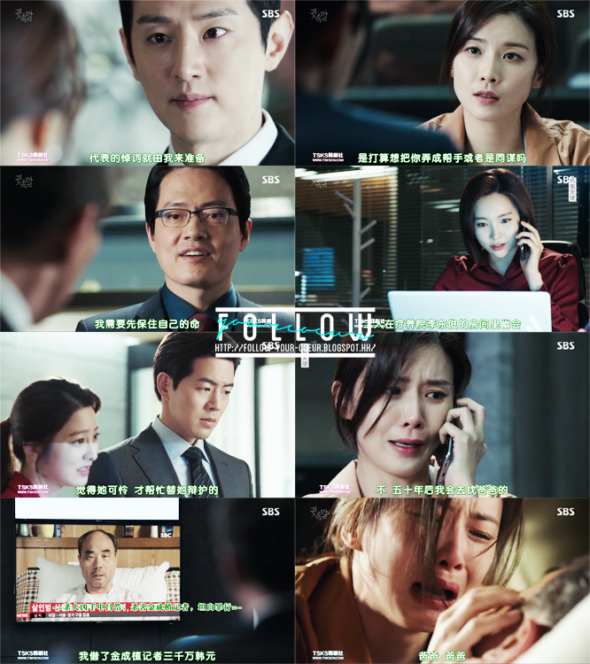 最後,正日看到英珠已經沒有退路了,所以主動去找她的爸爸,要求他妥協承認自己殺了金成植,他才肯將證明英珠無罪的片段呈上。英珠爸爸為了救女兒最後錄了認罪的片段,也取消了上訴…英珠最後也趕不及見上爸爸的最後一面,而他也含冤地離開了這個世界…(好黑暗啊,看得人很難過…最近政局不穩,也難怪大家不太喜歡這些題材,所以收視有點回落了…)