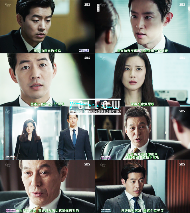 正日跟父親和助手商量對策的時候,秀妍去了酒店房找他。(其實為什麼這麼粗率?知道有人來了也不收好所有東西才開門-.-?) 她看到他們在準備證據將罪名推在自己身上,所以也心淡了,最後回去找東俊幫忙,拍了陳述片段,指證正日。
