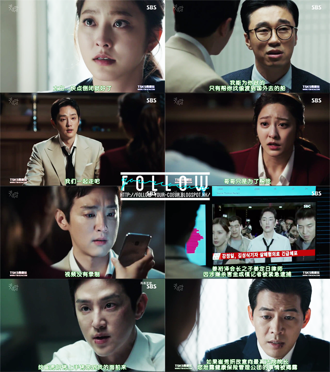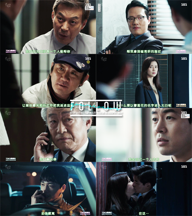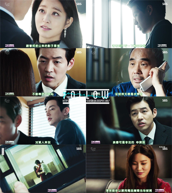 上集說到秀妍為了要救媽媽,所以將正日的罪證交給了英珠。正日在英珠逮捕他之前先一步逃走了,慶虎安排他逃亡,他不想再跟正日一起做更多壞事了,因為他自己有妻兒,不想連累他們。但是正日又不服秀妍將所有罪名推到自己身上,所以一直在想怎樣可以把秀妍拖下水。另一邊廂,英珠為了要捉住正日,問了宋秘書的意見。宋秘書提議用秀妍來刺激正日,讓他們見面。(其實…我說後部基本上不是宋秘書的話,英珠跟東俊沒有可能這麼順利做到這麼多事。不是宋秘書幫忙聯絡不同的人,再威脅他們的話,他們根本就沒有可能走到這步。而其實宋秘書已經成功將一煥入罪,其實他也沒有那麼大的誘因去幫他們做那麼多事…所以其實有點奇怪,即使他這樣做可以幫他減刑,但是後來的協助好像太積極,甚至成為了破案的關鍵?)