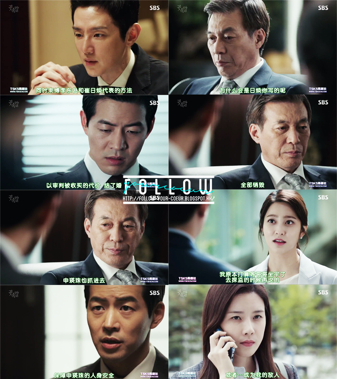 但是一煥那邊也不容易對付,因為他聯絡了很多人,想阻止英珠以嫌疑人傳召他。可是這些人的手腳也不乾淨呢。在英珠的勸說下,宋秘書打了好幾通電話,要脅他們不要聽一煥的指示,因為他手上有他們以前貪污的證據。而一煥原本想跟法務部長官串通口供,說他們案發時在一起。但是正日也攔住了。無計可施下,秀妍偽造了正日殺人的證據(染血的恤衫),可是不夠1分鐘就被正日識破了。不過秀妍也不笨,這個計劃失敗了就用眼淚攻勢,扮可憐引正日說出他殺人的真相—但是正日不知道她偷偷錄下了他們的對話。