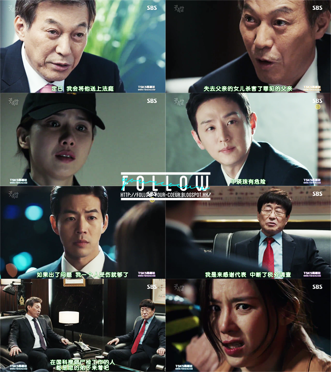 不過姜正日的後台也不小,他的父親是寶國產業集團會長,勢力很大。大得連崔一煥也要防他一手。而且野心超大的,表面上跟崔一煥是互相合作,可是他們私下也明白對方想除去自己。東俊的人還真是算很不錯了,身陷險境還偷偷幫英珠找人幫她處理她爸爸的案件,希望可以幫他洗白。可是背後的勢力太強大,他能力也十分有限。英珠以為東俊沒有幫她,所以決定自己繼續查下去…然後一邊施加壓力給東俊,要他一定要幫她撥亂反正。(寶英歐尼好帥!!這句真的要每集說一次!!真的超帥!!!!!)