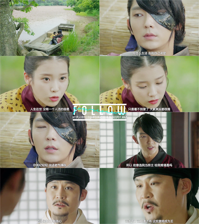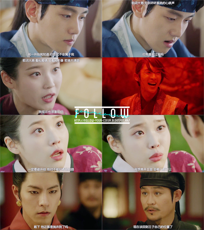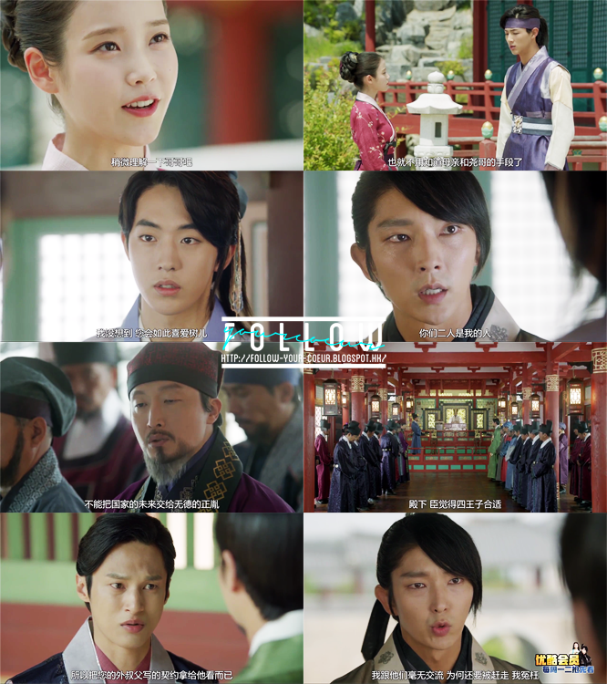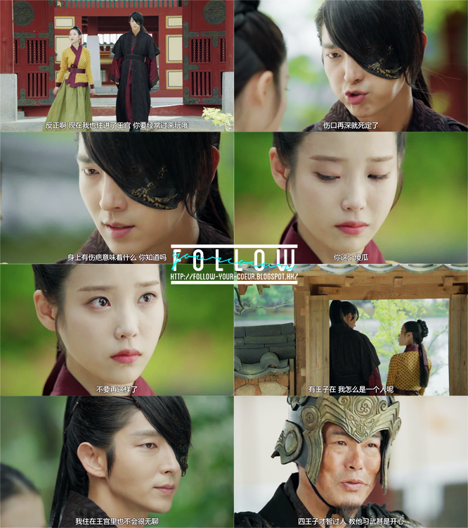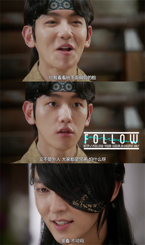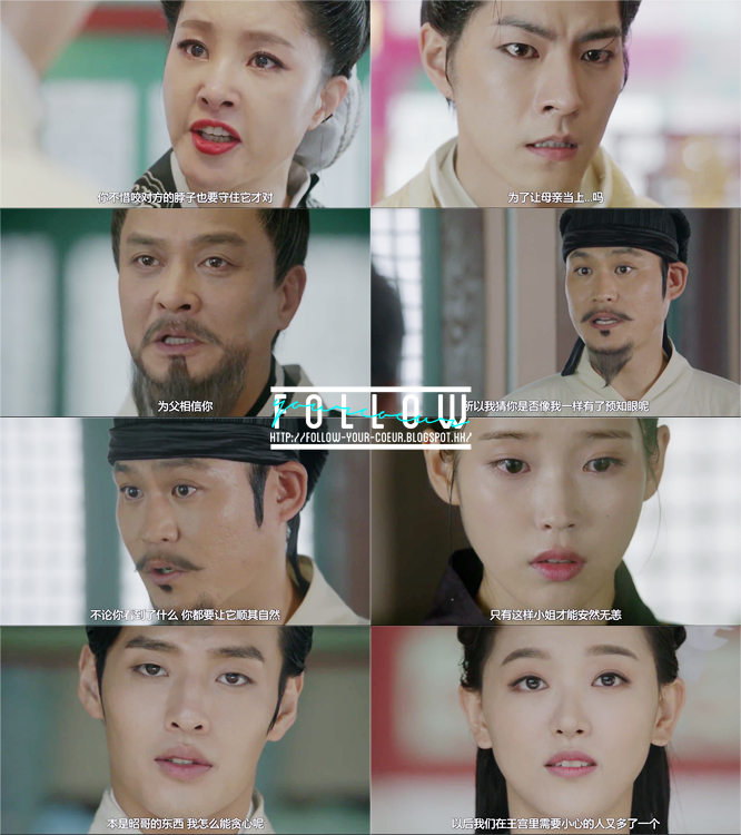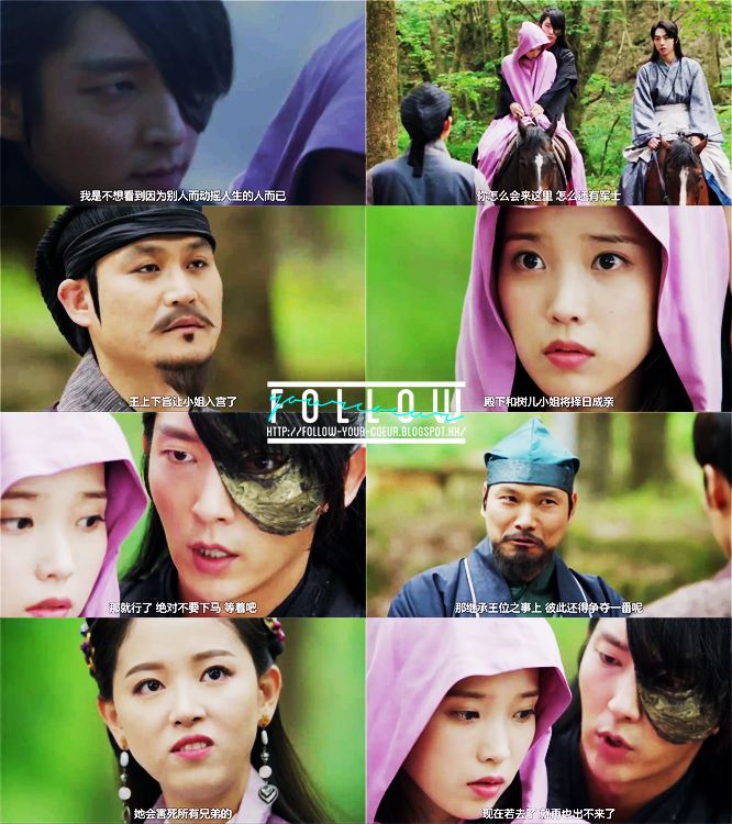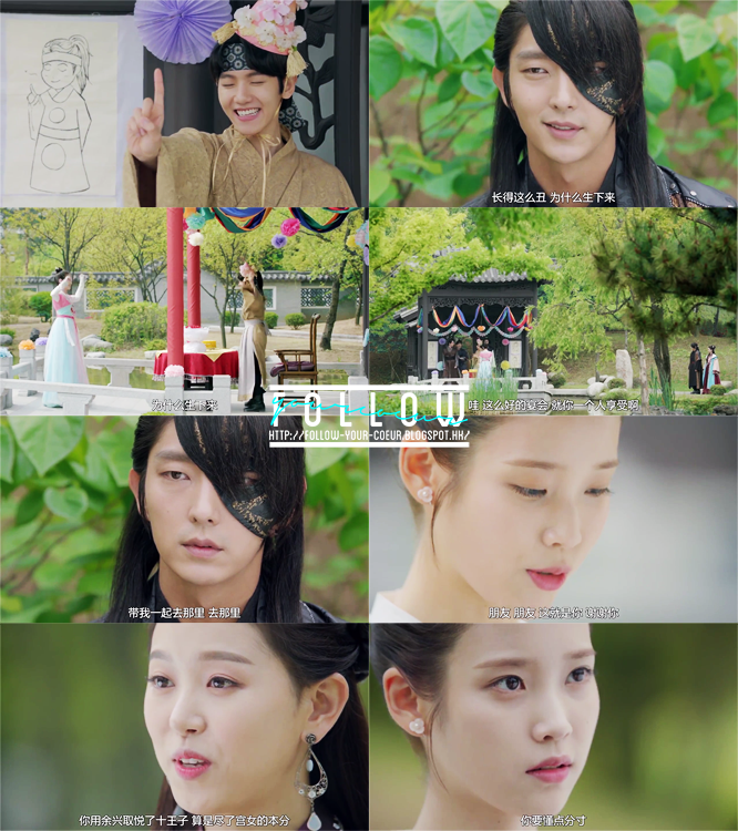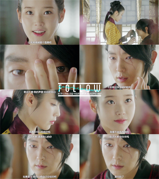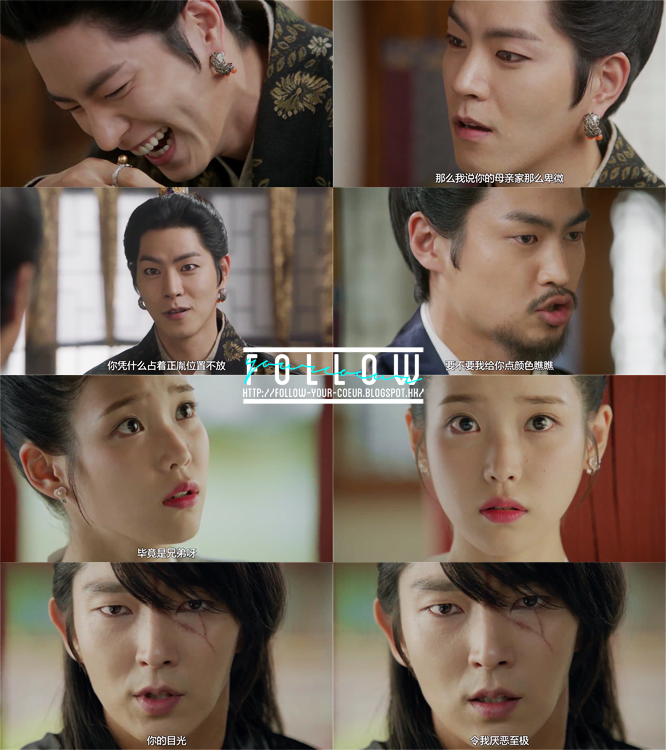 可是答應了,王昭就真的除下面具了…特別截了所有人的表情,可以看得出除了三王子和九王子看戲的心態,其他人都是覺得驚訝、後悔、不便、尷尬等等的表情…所有人都是不敢和王昭對眼的,只有解樹一個可以望著他。(其實我明白劇本是想表達解樹的表情是不同的,IU應該要表達的表情應該要是不帶歧視或同情,沒有特別的眼光,只有普通的像看平常人目光。這裡IU欠了一點功力~IU這裡的感覺帶不到出來…不過要表達這種眼神真的不容易…)