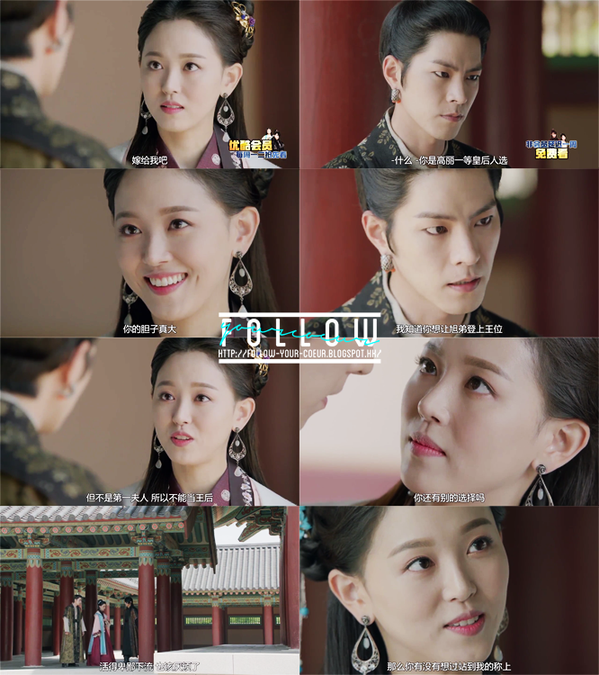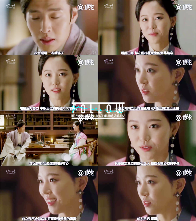 王堯找機會抓了妍華到外面去,說要娶她,當然妍華很清楚對方的目的,但是她希望自己能幫哥哥登上王位,這點王堯也很清楚,所以以皇后這個銜頭來引誘妍華,不過妍華也知道她不可以成為第一夫人,所以其實權勢也很有限…正當王堯咄咄逼人的時候王昭走出來幫妍華了,妍華在王堯走了之後用個婉轉的方法問王昭有沒有興趣娶她…(真是明目張膽的求愛,雖然同時是為了家族的地位…)
