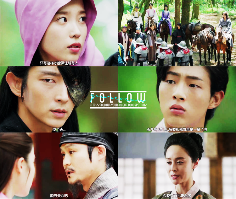 王旭說了這麼多次,終於有一次是真的行事了!他向母親皇甫氏請求跟解樹結婚,然後就離開皇宮…妹妹妍華當然不同意,因為他們的家族四面受敵…其實母親也為了家族的鬥爭感到厭煩,所以沒有阻止王旭,不過再三提醒他要小心這個決定的後果,因為外家一直寄望他成王…妍華對於母親這個決定完全不同意,因為她不希望自己、母親,甚至自己的家族再被人欺負,所以決定要自立門戶,主動跟劉氏聯手了…(野心也是很大的女人…全部都是利用和利用…) (妍華說皇甫氏因為太祖寵愛的宮女小產而被劉氏誣陷趕出宮,我懷疑這裡是指吳尚宮~)
