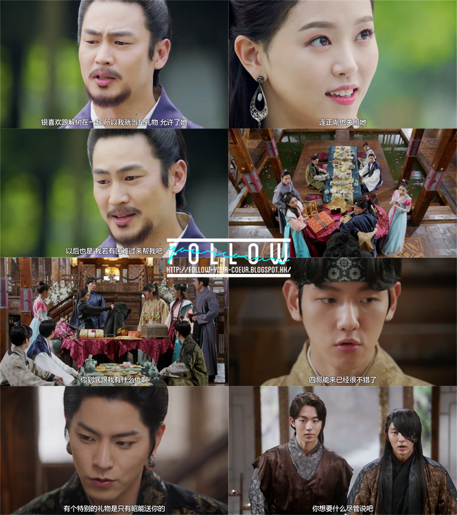 連正胤也出來幫解樹說話了!除了三王子之外基本上也挺喜歡解樹的!除了九王子會看時勢挺解樹之外~~~ 順德打算送熊皮給王銀,但是反而被她嚇到了XD 王堯藉著今天的聚會叫王銀問王昭拿禮物…王銀擔心王昭不會給他,所以連解樹也開聲說王昭很好人,想要什麼也會給的…