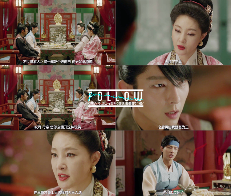 突然畫面一轉,居然一家四口在一家吃飯…但其實是王后劉氏想利用王昭殺掉正胤…(現在都不隱藏了= =當著面說要推王堯上去了…這或許也是王昭野心漸漸擴大的原因之一?證明自己比哥哥有能力?) 現在的王貞還沒有變,對於母親大膽的言論感到憤怒…(如果你能一直保持就好啦…可惜最後大家都四分五裂的…)