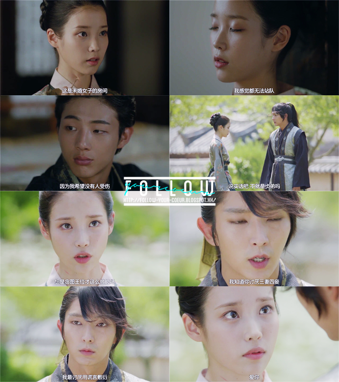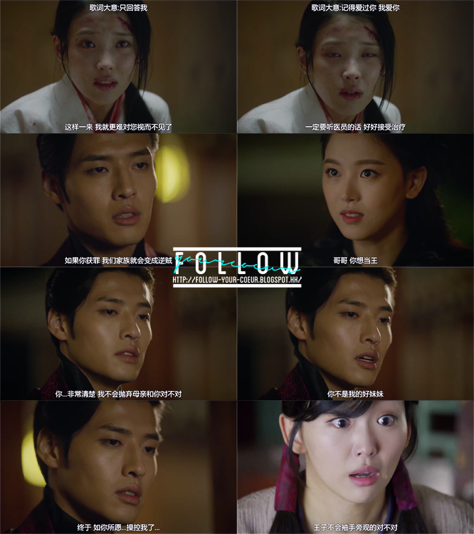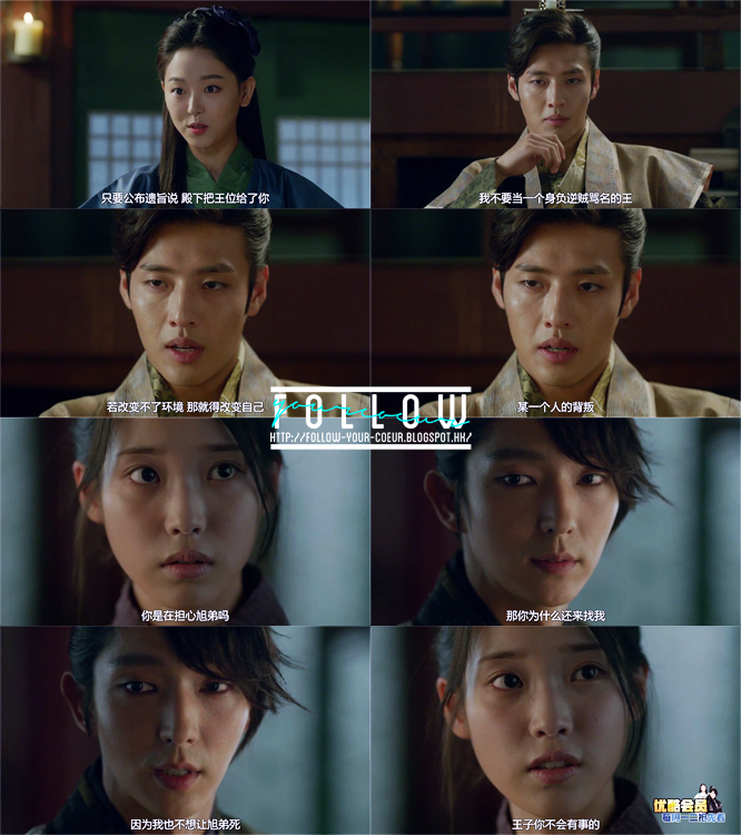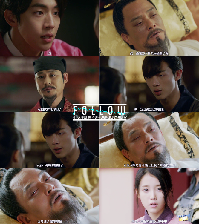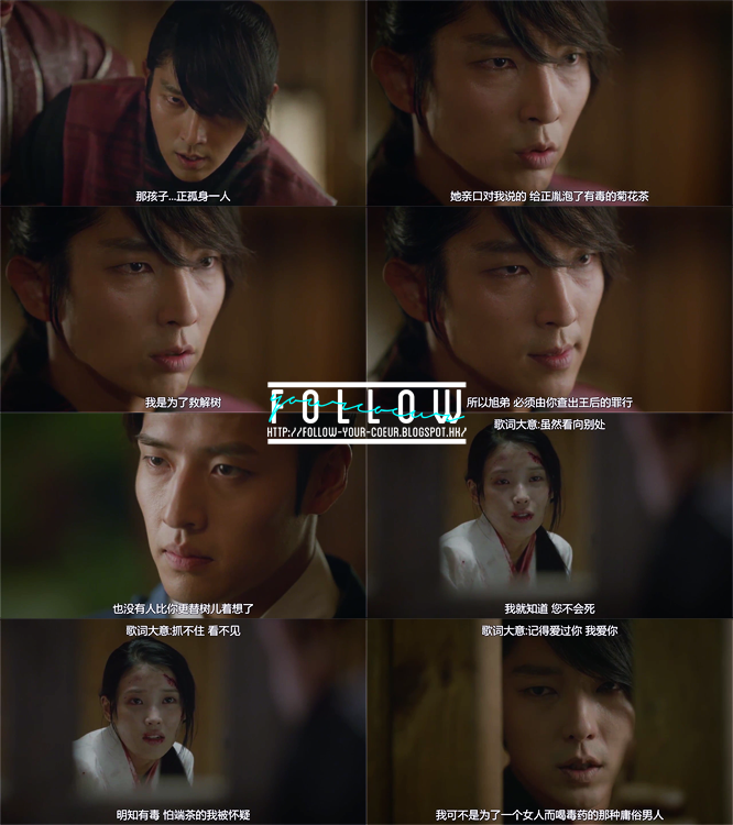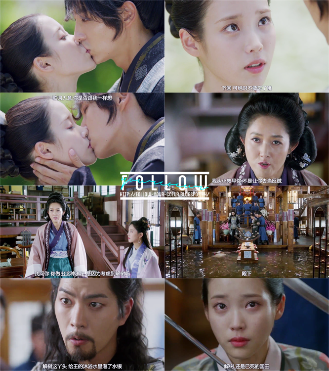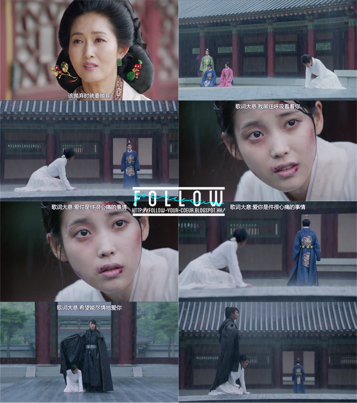然後就是連連的對比場景,王郁、王貞和王武看著傷重的解樹都很心疼,但是自己無法做點什麼,只有一起淋雨和跪地陪她一起求情…王旭走來了,但是想起背後的負擔,走了。(這裏IU處理的表情很到位!歡喜到失望的表情!加分!可以補足之前看王昭的眼光做的不夠好的表情!) 走了一個王旭,來了一個王昭,默默地為她遮風擋雨,陪她一起淋雨。(這樣才真的是愛吧?會為對方犧牲,對方心疼時也跟著一起心疼。雖然對比起王旭而言,王昭的包袱少了很多,因為他從小就不被重視,家族威望的重擔不在他身上,他少了這份重擔,所以才可以這麼不顧一切地愛解樹。初時還未看完整版的時候,只看王旭走的那段都覺得他很壞,但是看完了這集又體諒到他的無奈…不因為他的退縮而討厭他,只是可憐他背負太多。不過你答應過解樹的事始終沒有做到…你叫她等你,她等你,可是你走了…)