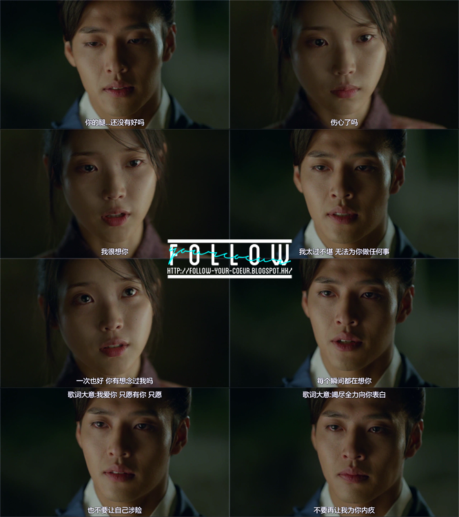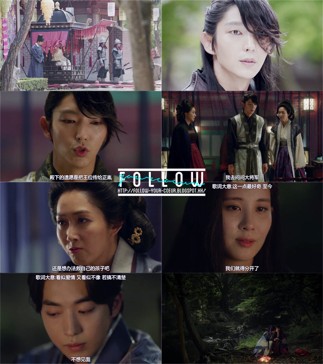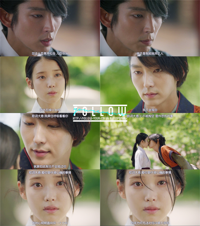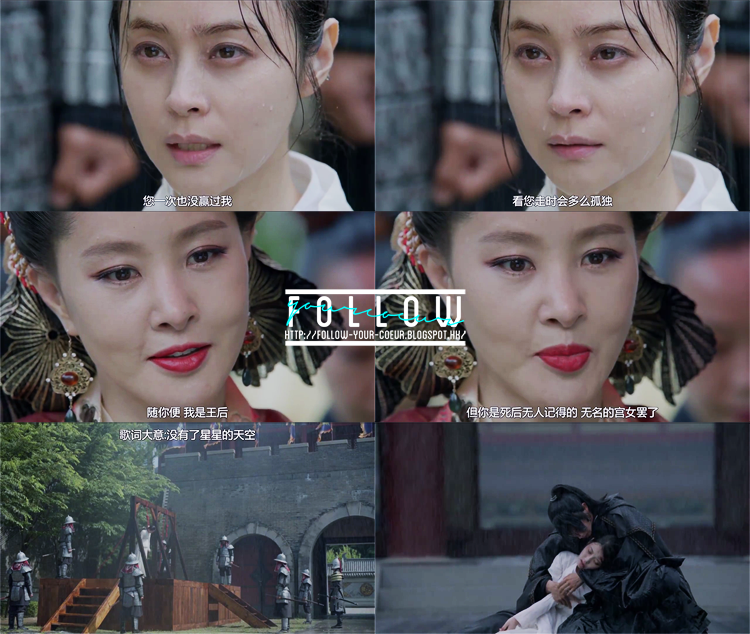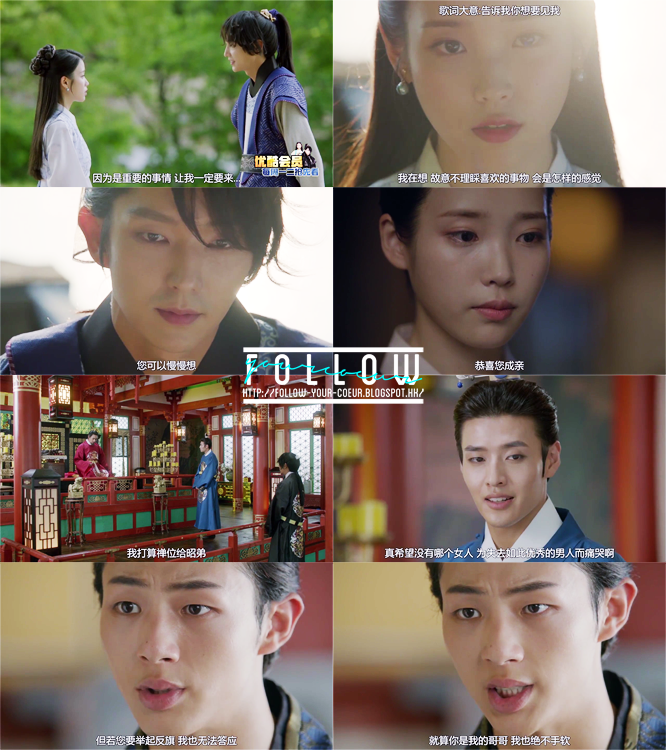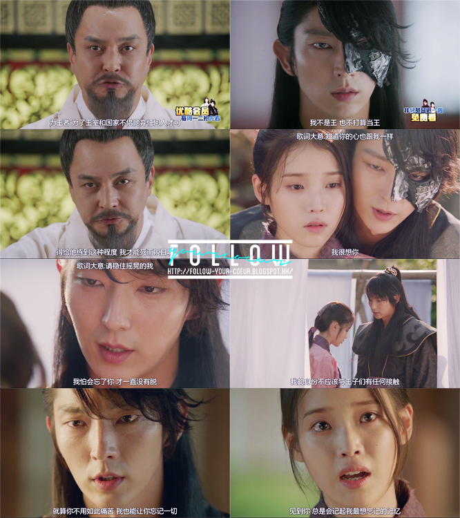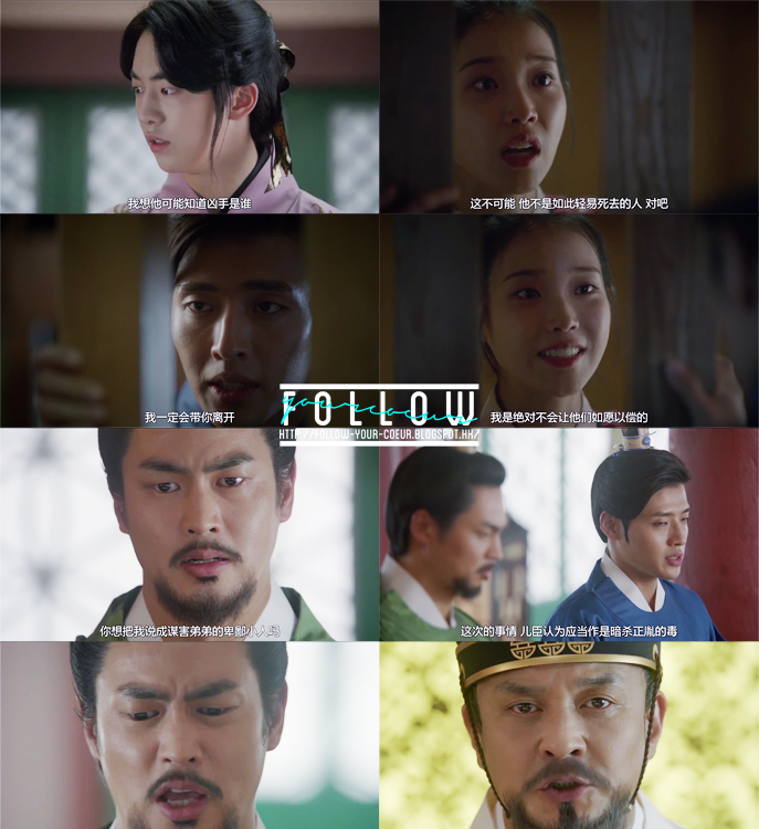 然後就是連連的對比場景,王郁、王貞和王武看著傷重的解樹都很心疼,但是自己無法做點什麼,只有一起淋雨和跪地陪她一起求情…王旭走來了,但是想起背後的負擔,走了。(這裏IU處理的表情很到位!歡喜到失望的表情!加分!可以補足之前看王昭的眼光做的不夠好的表情!) 走了一個王旭,來了一個王昭,默默地為她遮風擋雨,陪她一起淋雨。(這樣才真的是愛吧?會為對方犧牲,對方心疼時也跟著一起心疼。雖然對比起王旭而言,王昭的包袱少了很多,因為他從小就不被重視,家族威望的重擔不在他身上,他少了這份重擔,所以才可以這麼不顧一切地愛解樹。初時還未看完整版的時候,只看王旭走的那段都覺得他很壞,但是看完了這集又體諒到他的無奈…不因為他的退縮而討厭他,只是可憐他背負太多。不過你答應過解樹的事始終沒有做到…你叫她等你,她等你,可是你走了…)