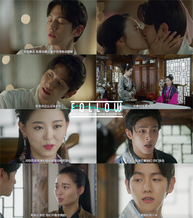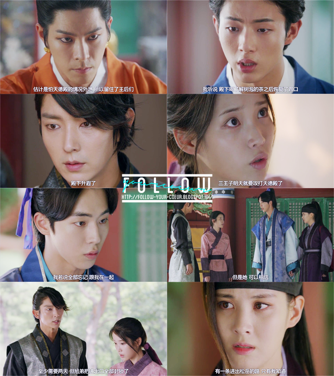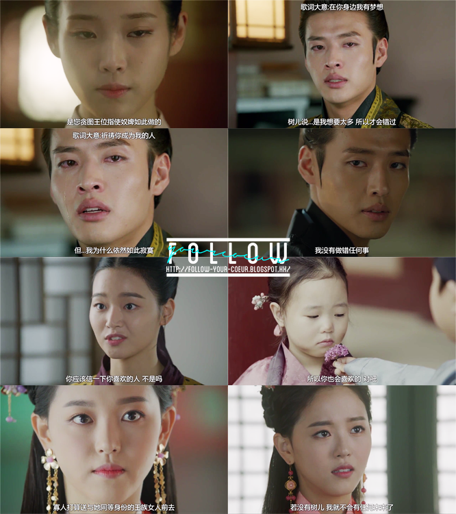知道了王旭的試探,解樹感到很傷心,因為她覺得王旭沒有相信過她,只是一直在懷疑她的心意。她說他們可以請求正胤讓他們出宮,但是王旭說沒有這麼容易。其實以正胤善良的性格來看,他一定會准許的。因為二人的價值觀開始遠離了,所以解樹也開始想跟王旭保持距離…慢慢要收回自己的心了… (其實不簡單的是王旭—因為他自己也不知道他的野心比愛解樹的心還要大。)