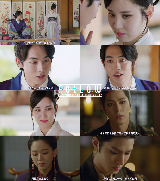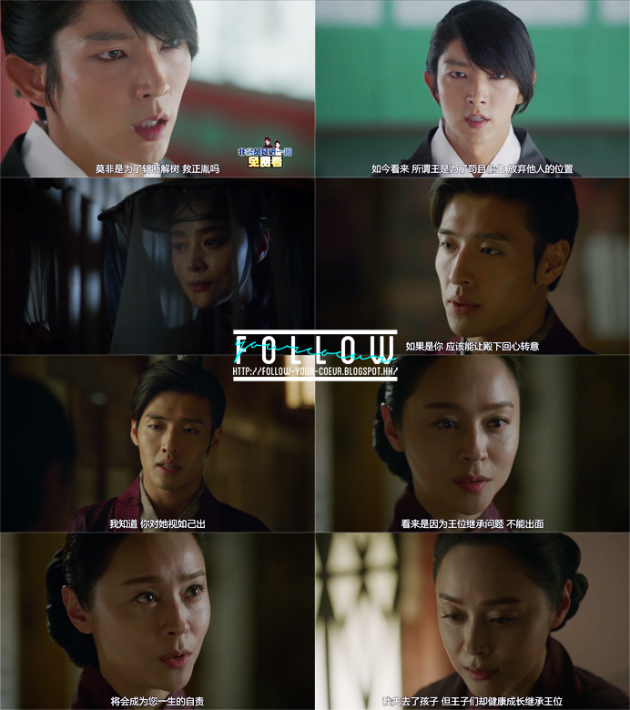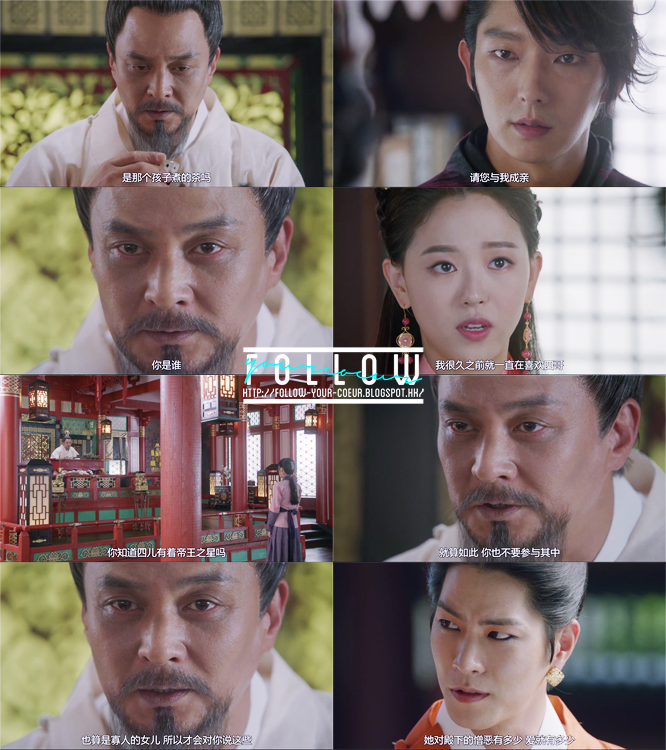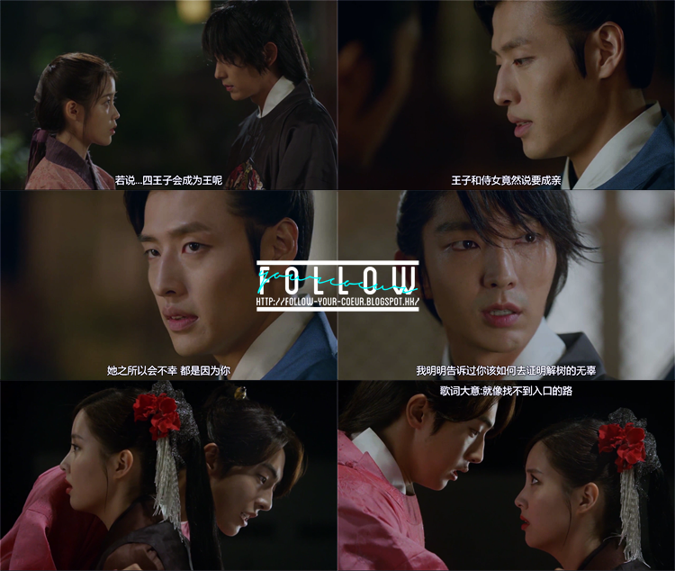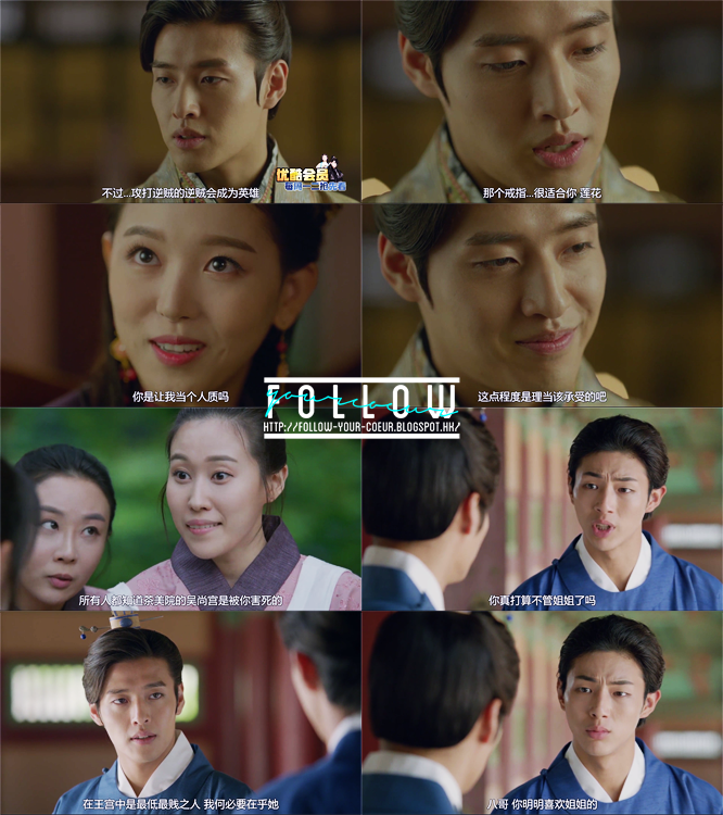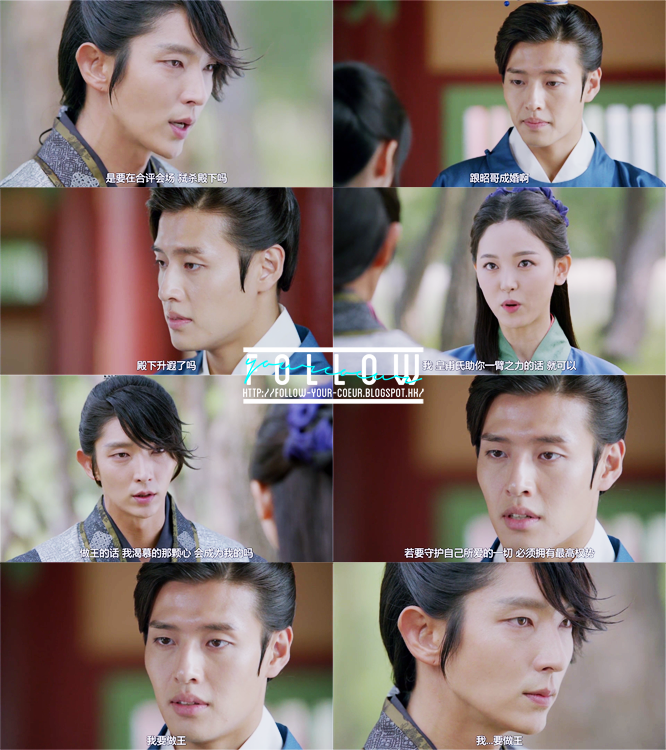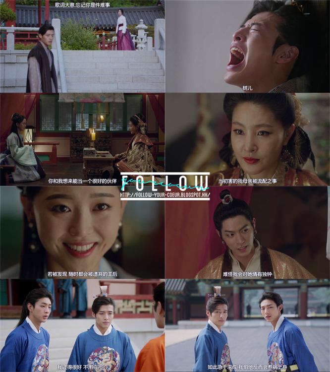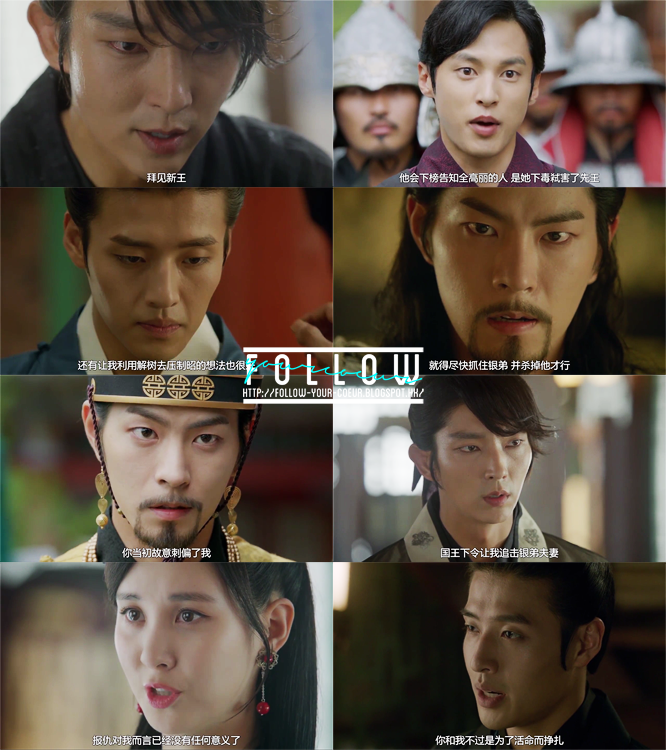還未復原的王昭去看解樹,遇上了王旭,因為知道他著緊解樹,所以相信他,告訴他這一切都是王后劉氏的所為,叫他幫忙查出證據。然後就去了見解樹…解樹也不蠢,知道王昭是為了救她而以身犯險!王昭死也不承認自己是為了解樹~ (幸好幸好編劇不是寫解樹是個大笨蛋,否則我會氣死的!BTW 這裡二人的眼神交流很好啊T_T 李準基大神的演技沒有不好過嗚嗚嗚…)