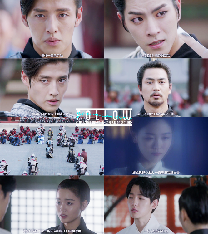 (這裏真的剪到亂七八糟…我明白想對比王昭和王旭對於成王的看法和態度,但是這樣的剪接轉來轉去,兩者說話之間的剪接太快,反而變得很亂…跟THE K2(點連結可看看我關於THE K2的劇評)不同的是我第一集已經覺得剪接很精彩,因為剪接的時間很合適,而且很連貫,可以很完整地表達出那種對比。依舊為步步的剪接感到失望…)