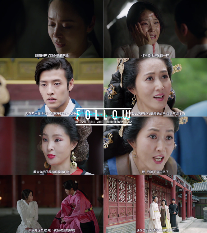 王旭知道解樹因為吳尚宮代罪而跪地不起,所以想去幫她,但是受到母親和妹妹的阻止,皇甫氏其實也很心疼,因為吳尚宮跟她一樣一直被劉氏逼害…所以後來也有幫忙求情…但是當王旭看到母親卑微的向劉氏求情的時候,就覺得很憤怒,但是自己什麼都不能做…(其實皇甫氏也是個好人,只是在這個時候她也是為了想保住自己最珍貴的孩子們…這個時候也肯為吳尚宮求情T_T)