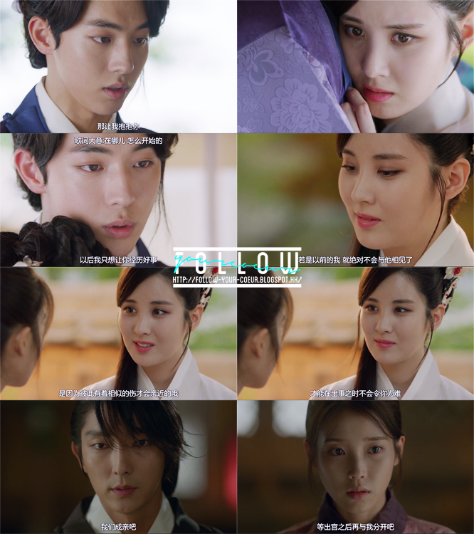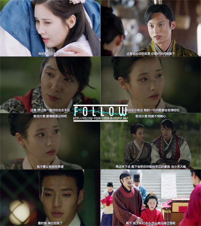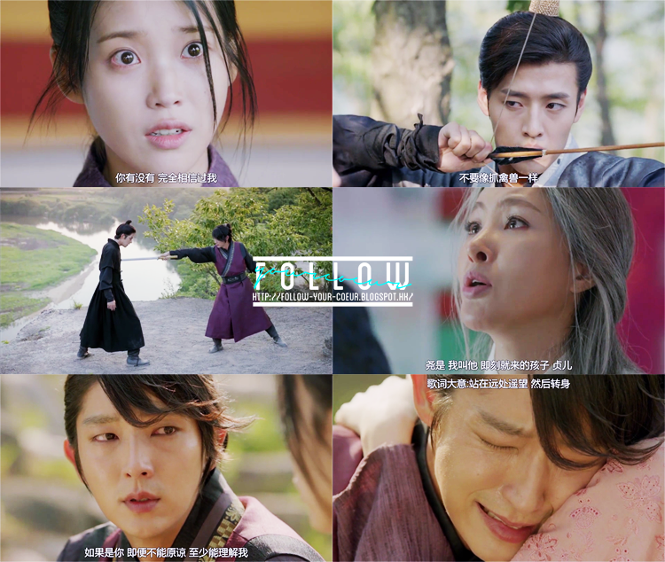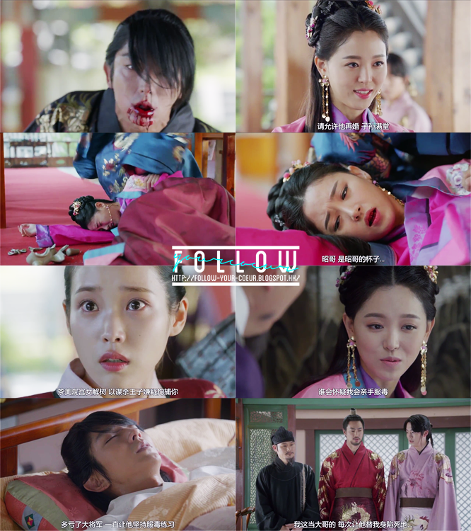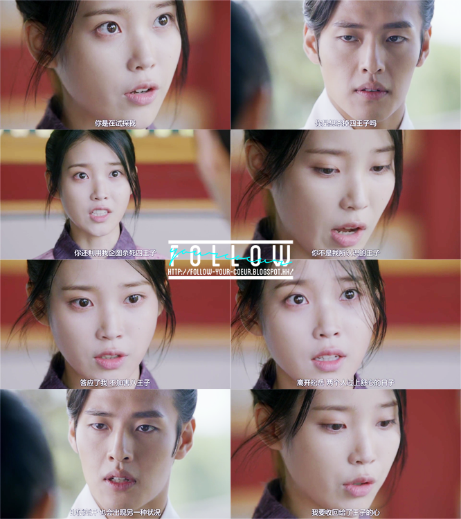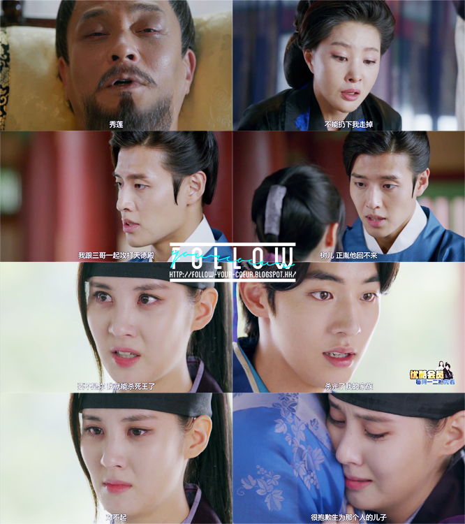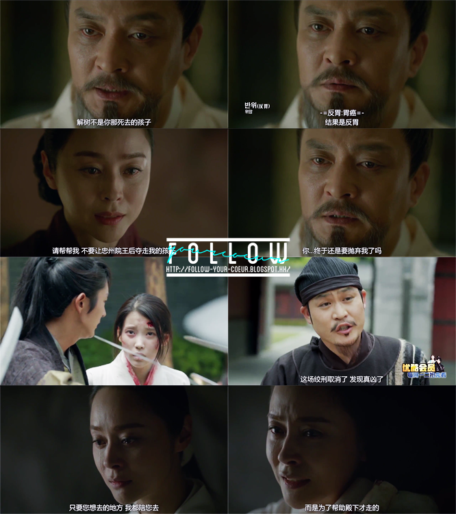 解樹準備受刑的時候王昭…只有王昭一個出來救她了…然後知夢就告訴他們找出真兇了…當解樹看到那個人就是吳尚宮的時候馬上反對,想帶她走…(這段真的哭死我…我好像沒有說過我一開始看見吳尚宮就覺得這個演員很美很有氣質!不得了!這幕的感情真的T_T 她看著解樹的心痛表情真是十分十分入肉!雖然IU演起來沒有禹喜珍(即是吳尚宮)那麼有感染力,但是二人的對話和禹喜珍帶動了很大部份的氣氛,所以整場戲真的很沉重T_T BTW禹喜珍真的很有氣質,很適合演古裝!)