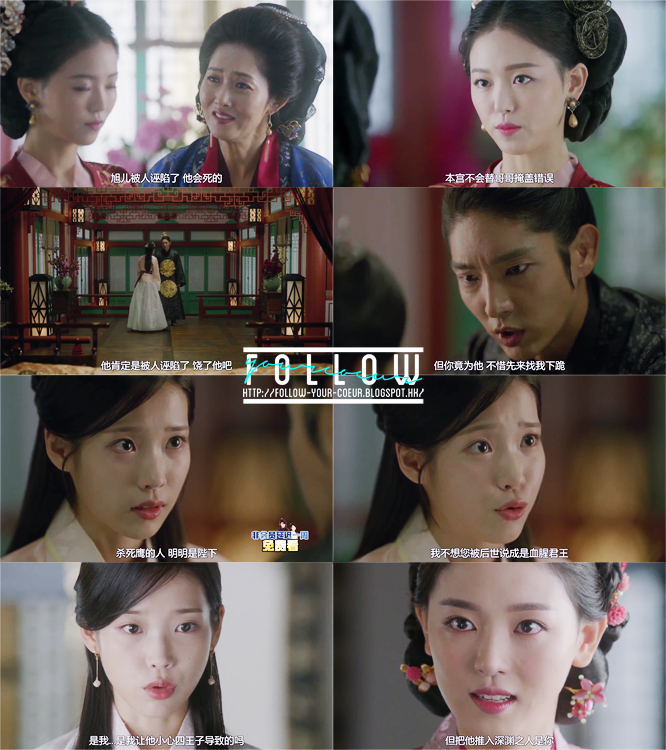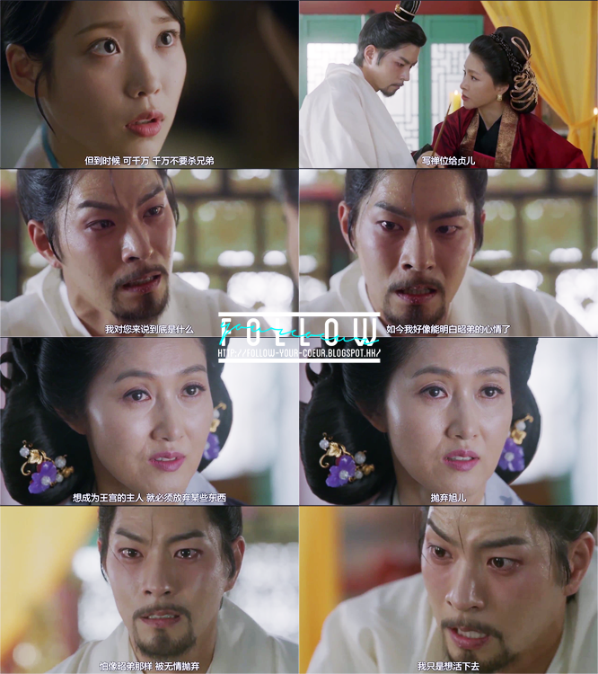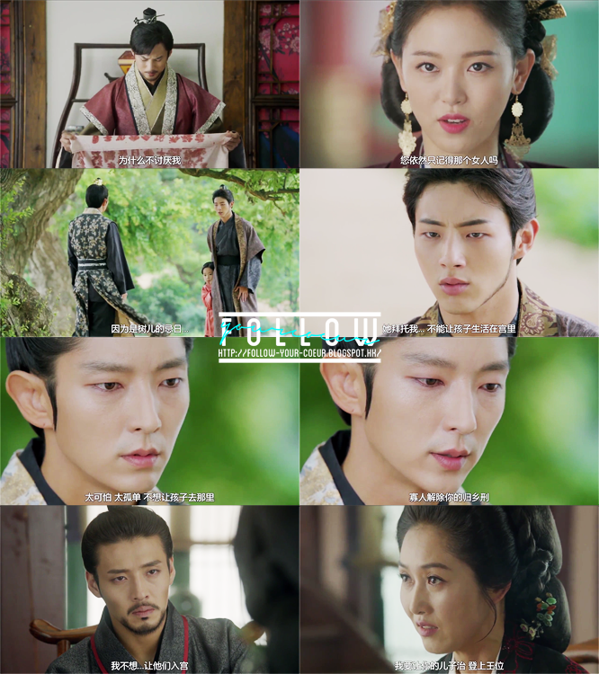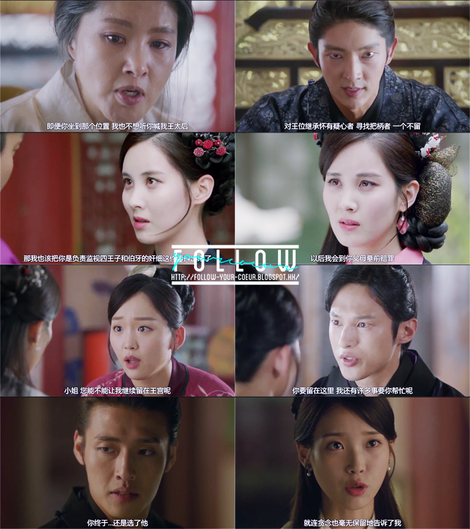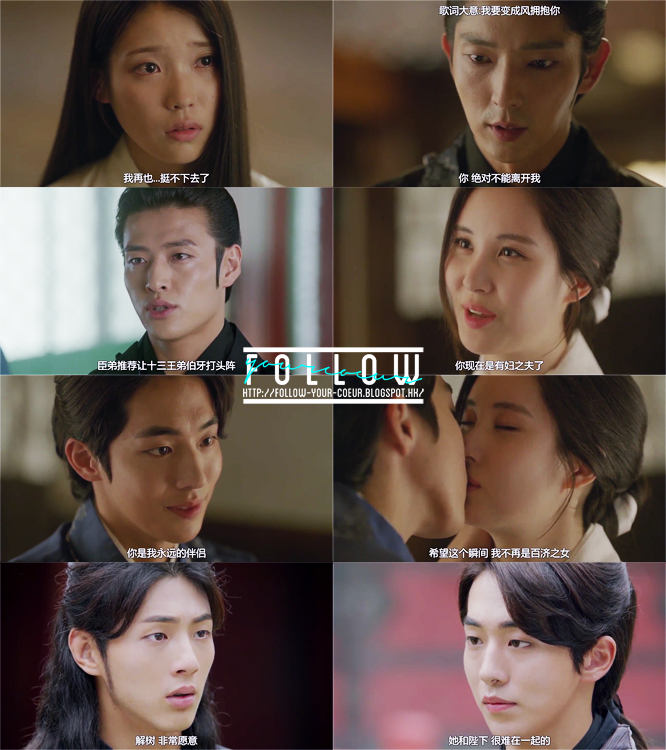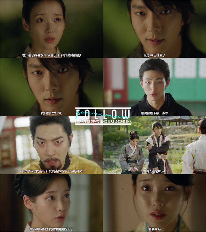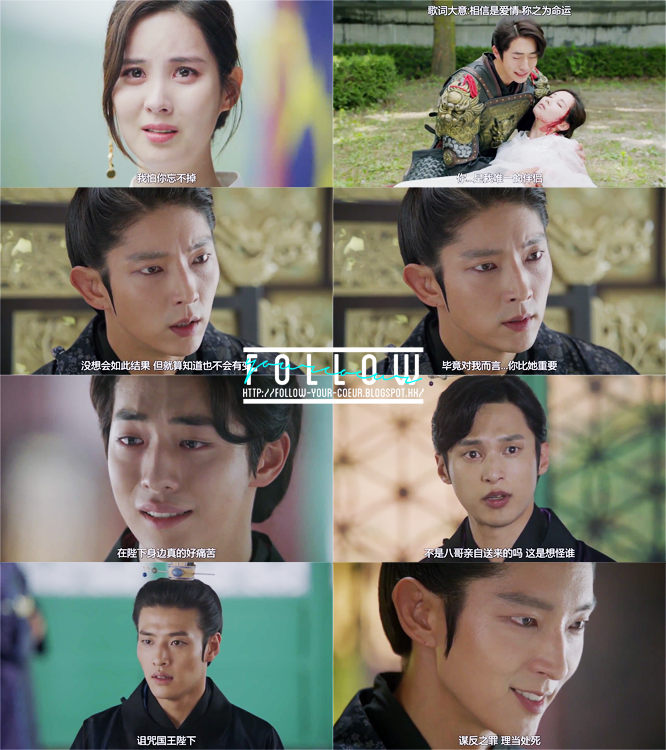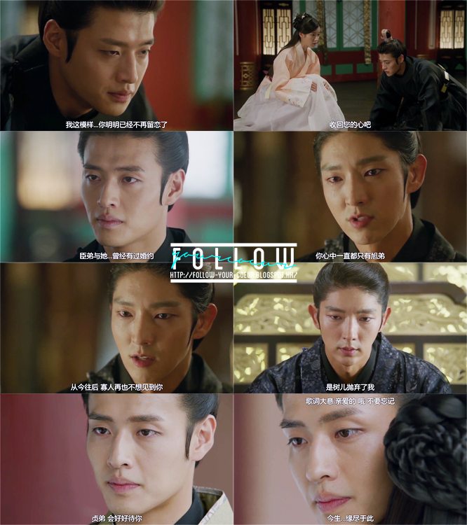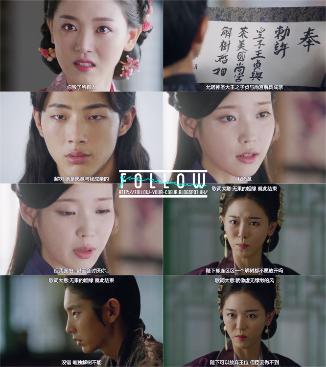 王旭在解樹出宮前跟她道別,叫她忘掉所有東西,他們就在今生緣盡了。(這段剪得不錯!台詞也寫得挺好的。之前因為王旭的角色轉奸了,份量也減少了很多很多,所以我都開始忘記了姜河那的演技了。相隔很多集後,王旭跟解樹終於有同場對話的畫面了。這段很短,但是很催淚T_T 因為結果王旭真的要放手了。河那這段棒棒!)