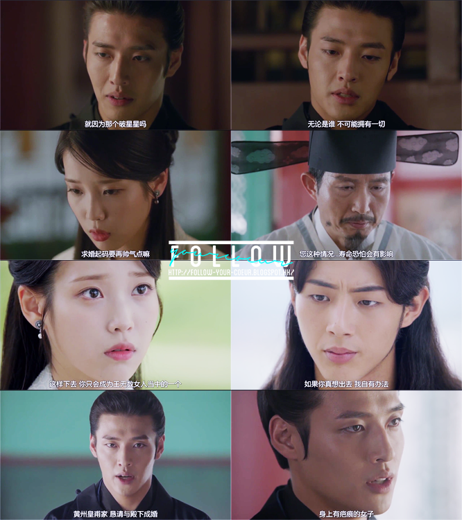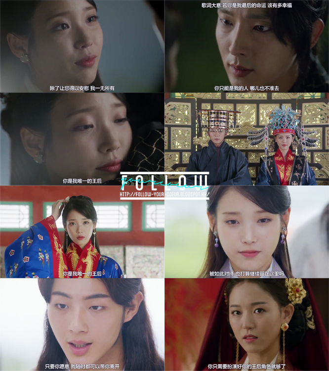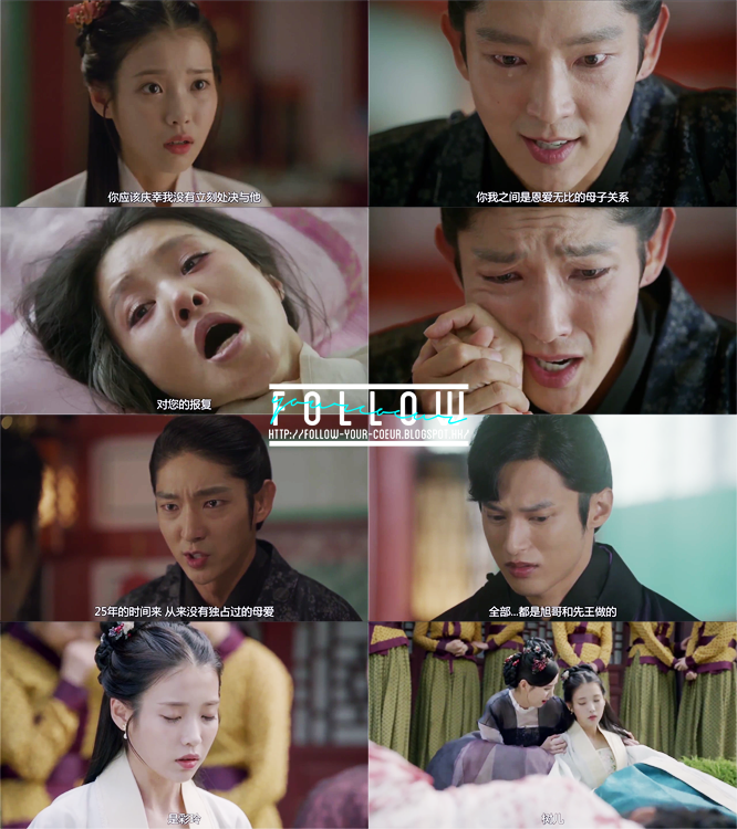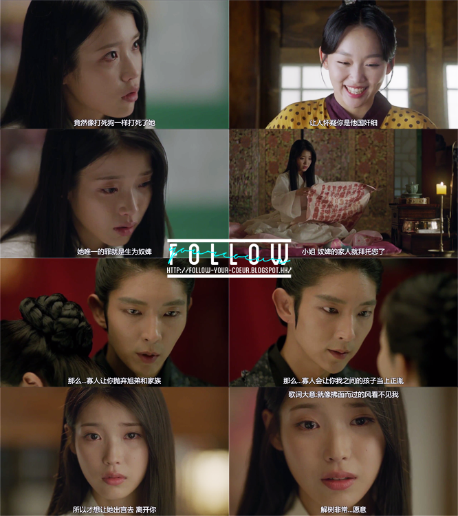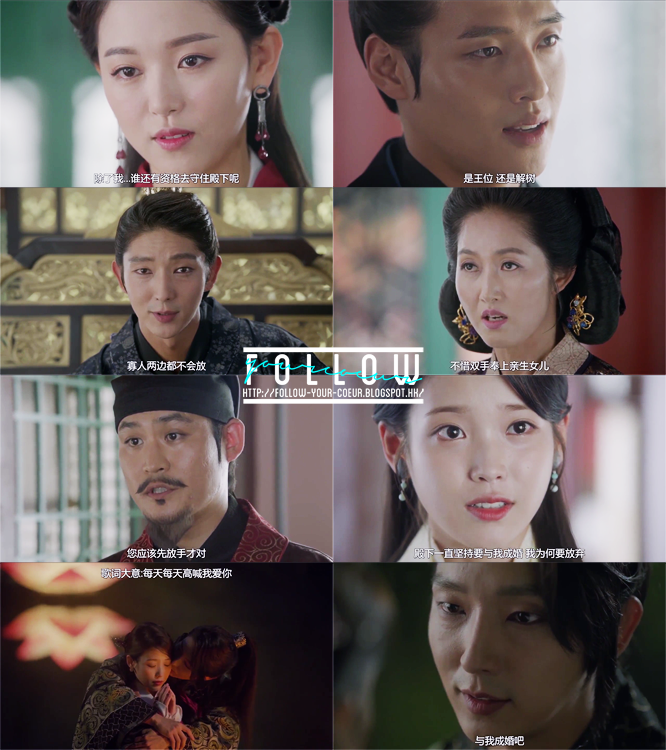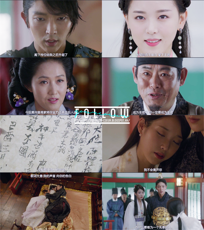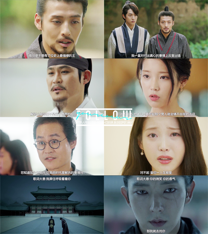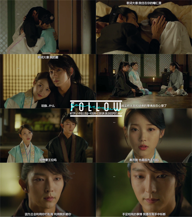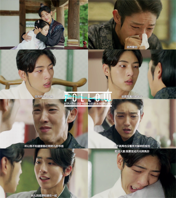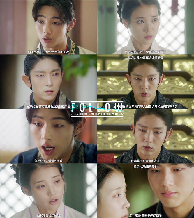王旭在解樹出宮前跟她道別,叫她忘掉所有東西,他們就在今生緣盡了。(這段剪得不錯!台詞也寫得挺好的。之前因為王旭的角色轉奸了,份量也減少了很多很多,所以我都開始忘記了姜河那的演技了。相隔很多集後,王旭跟解樹終於有同場對話的畫面了。這段很短,但是很催淚T_T 因為結果王旭真的要放手了。河那這段棒棒!)
