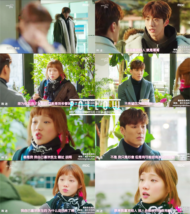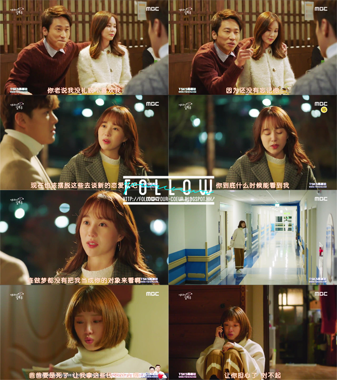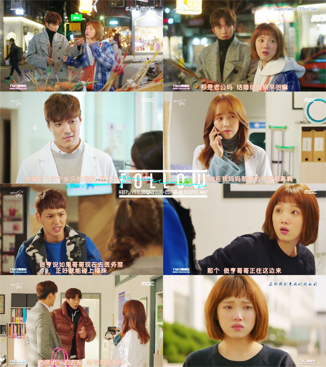 福珠收到載禮的電話,她以留學為由來跟載禮解釋自己不再去診所的原因。(這裡演得很好啊,聖經就這樣拿著電話一聽的時候就眼紅紅了!然後大家也知道拍這些場面的時候不是真的對話啦,聖經還真的一邊說一邊流眼淚啊*_* 作為一個模特為本業的演員來說,真心演得很好!) 然後她不開心就找了俊亨,俊亨就馬上放下手上的東西陪她了。(你到底什麼時候會發現自己喜歡福珠呢~~)