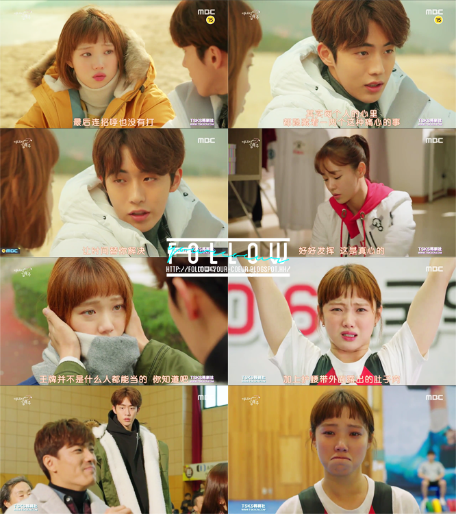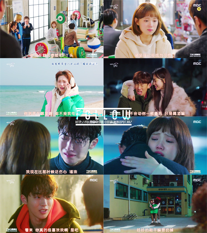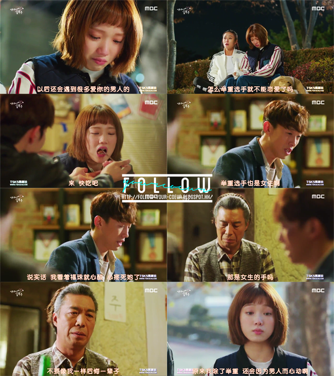 福珠因為被載禮拒絕了,加上教練又走了,令她做什麼都提不起勁。俊亨好不容易找到了她,問她為什麼總是要人擔人,看到福珠傷心的樣子又罵不下去了,一下子抱住她了。♥♥♥ (啊…俊亨這部份為什麼會令我想起對我而言可愛的她的時宇TOT)