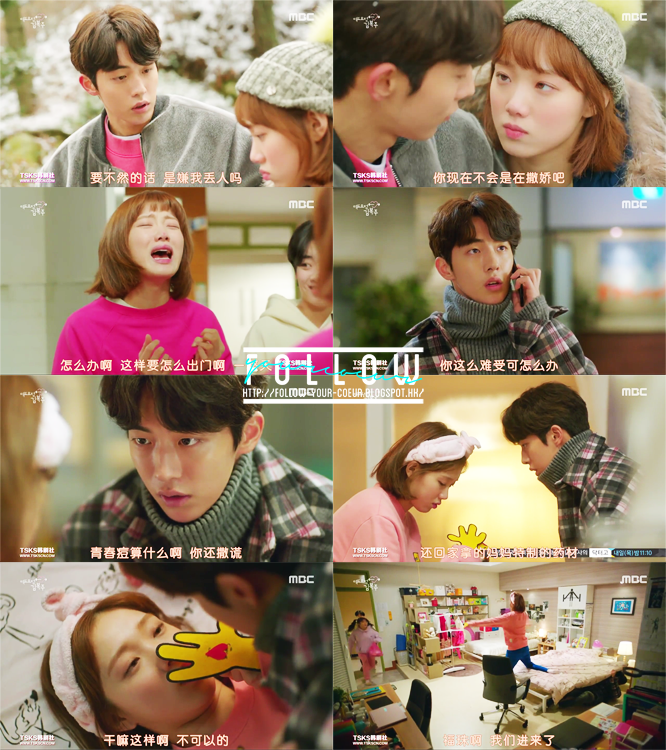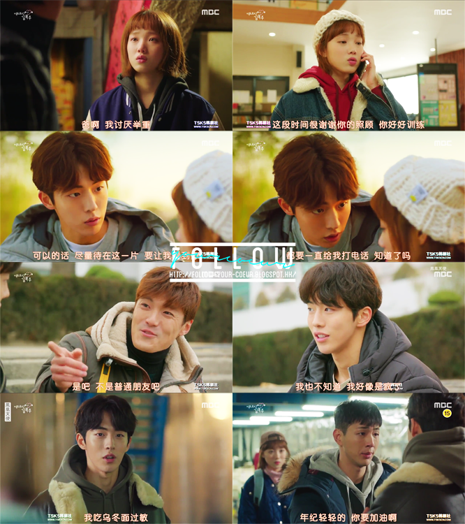 福珠因為不想被好姊妹說背叛了她們,所以不想跟俊亨公開關係~ 福珠的鼻頭生了一粒青春痘,就喊救命,蘭熙和善玉也笑她,整個舉重部也笑她,所以她不敢見俊亨,說自己重感冒了。(其實有沒有這麼嚴重XD 生顆痘連男朋友都不見了…南朋友的甜心舉動是不是迷倒大家了…XD 話說聖經穿的衛衣好可愛!那隻小手超可愛的!!肯定很貴~~~)
