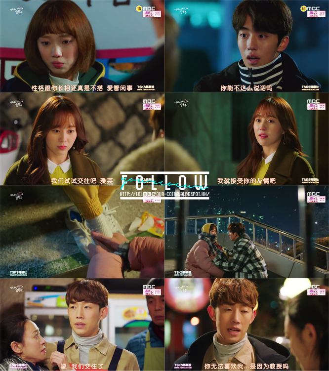 然後堂哥那邊又超突然,無緣無故走去找雅英表白,說自己這些年沒有注意到她,覺得她的付出是理所當然的,感到很抱歉,所以想試試交往。雅英拒絕了,說只接受他的友情。(堂哥這樣做又很笨啊,人家白白等了你10年,明明自己一直以來都對人家沒意思,別人表白後你一下子就說想過想試試交往,讓人覺得有種可憐自己的感覺啊…太急了…至少讓雅英下了火才慢慢開始互相培養感情也未遲嘛~ 這集的「劇評」我變得像個愛情專家怎麼搞的XD)