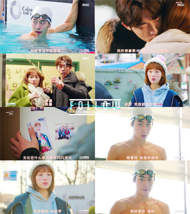另一邊廂,福珠因為比賽成績很好,所以可以去泰陵訓練,成為國家隊隊員。但是她一直就只記掛著俊亨,因為他受完衝擊後消失了。最後福珠在游泳池找到他,抱著他一起哭了。(這場戲應該拍得很辛苦吧,看到泳池都冒煙了,其實就是工作人員不斷在池水加熱水。大冷天真的辛苦了~~~)