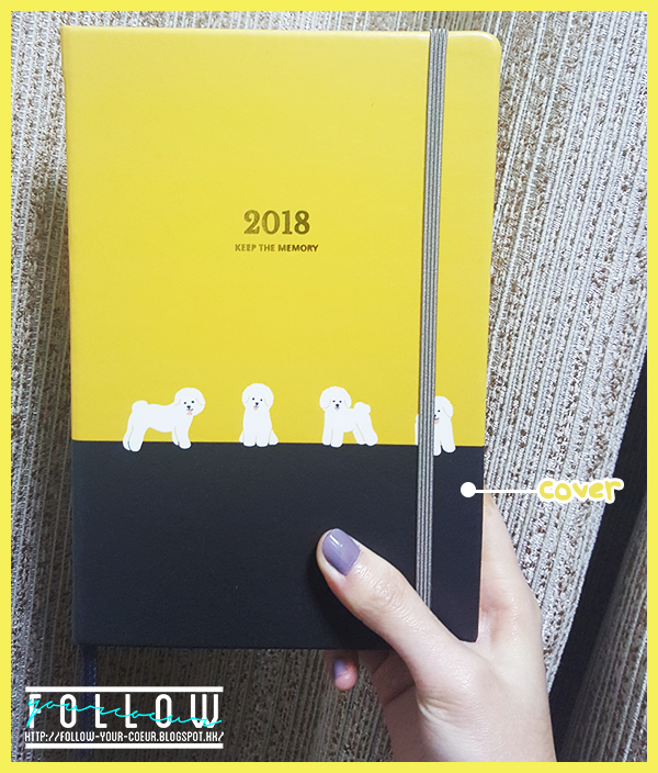 封面長這樣的,是狗年啊♥ 搭配上最近我很喜歡的芥末黃色。這本手帳比Iconic那本小一點,但是也厚一點。內頁不如Iconic的有設計感,是非常簡約的字型和排版。加上沒有那麼多功能頁,如Project Plan、世界地圖…不過它有齊我的基本3大要求—書籤繩、橡根和防水封面。