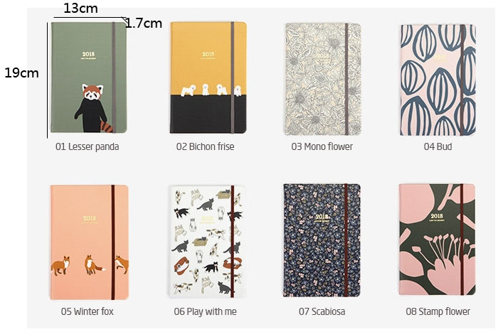 這本手帳一共有8個封面,內頁都是一樣的。我的手帳是2號那款,另外也挺喜歡1號的小熊貓的,其他的圖案都不太好看或是2018的字樣不明顯~