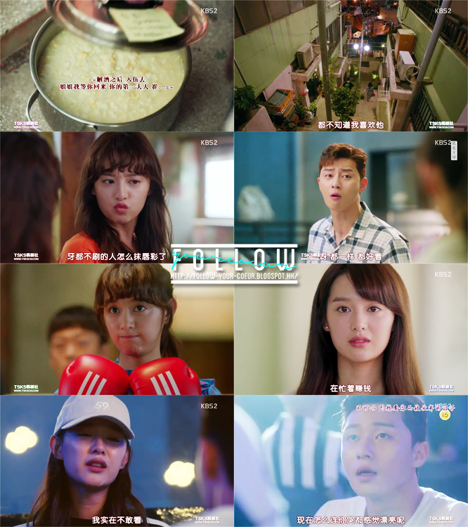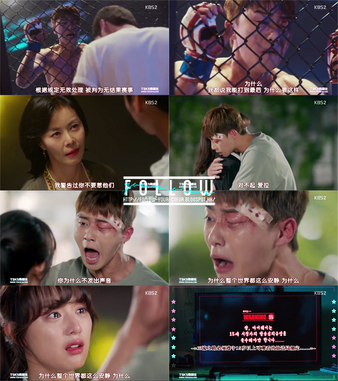 原本我也以為那個經理人這麼好心要勸東萬參加比賽,原來是卓洙的套路,他特意安排東萬比賽,然後偷偷拍下他輸掉的畫面來備用。愛羅眼白白看著東萬被打傷了覺得很心痛。(啊你們快點認知你們的心意好嗎!!!雖然有20 (*更新是16) 集,但是我想你們快點在一起啊!!看來要拖到差不多第10集才會一起??)